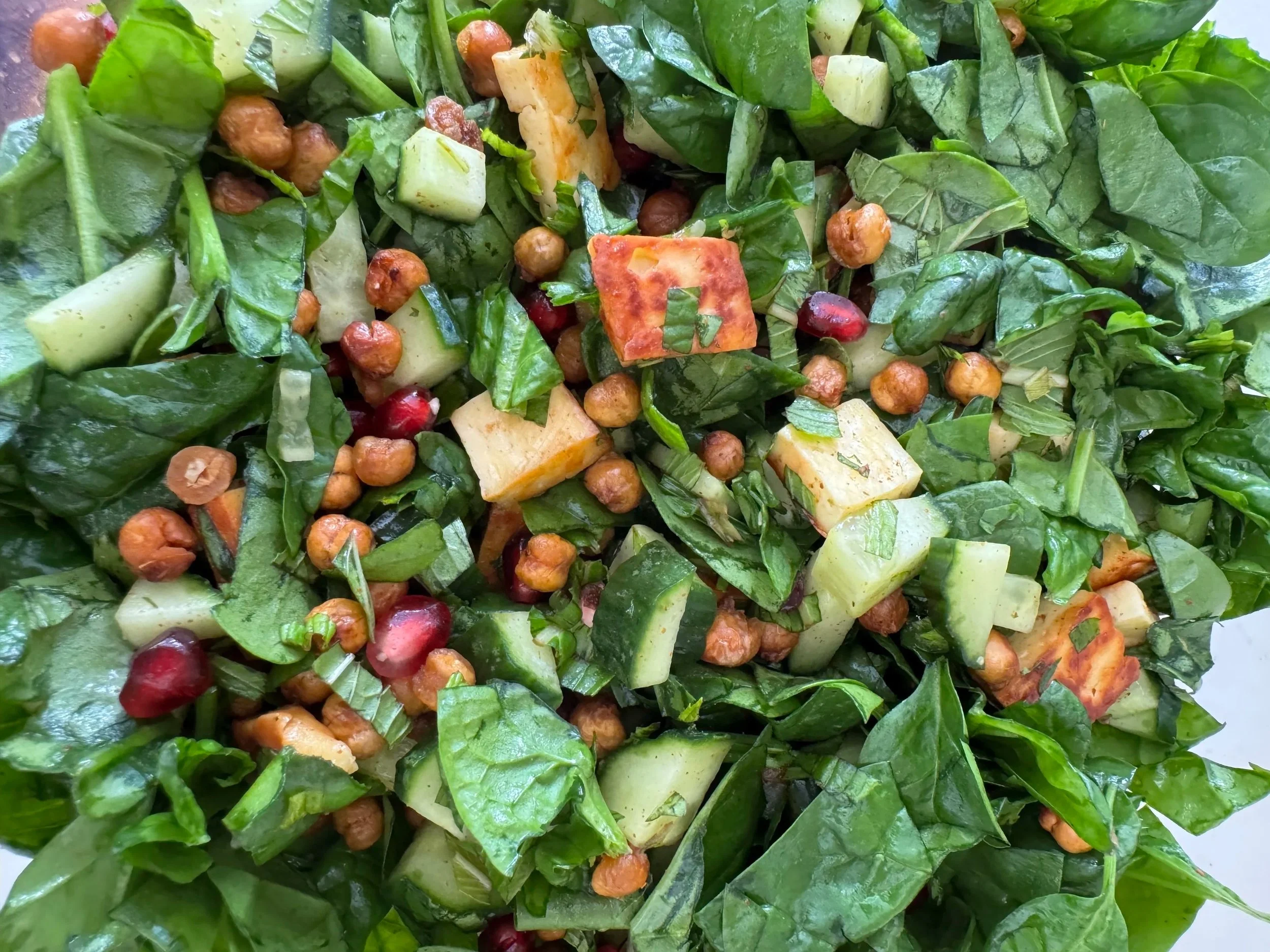 Cut halloumi into cubes and heat a pan with a dash of oil. Fry the halloumi until it starts to brown, then add 2 tbsp of the hot honey into the pan and coat the halloumi. Put this on a plate to cool while you start chopping spinach and mint.